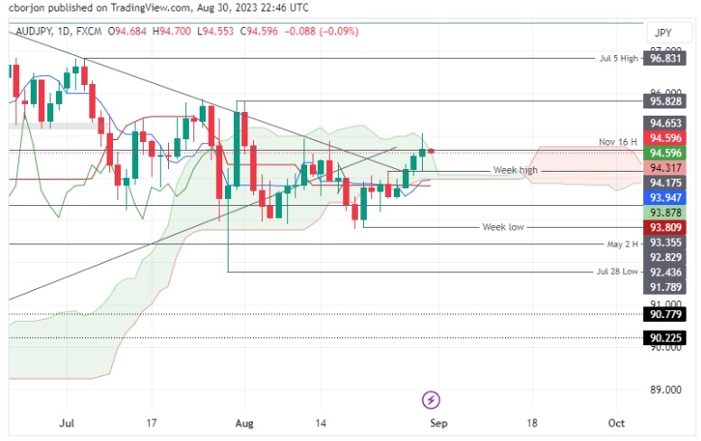 - AUD/JPY는 Ichimoku Cloud에 접근하면서 0.11% 하락한 94.58에 거래되고 있고 이는 중립에서 상향 추세로 전환될 가능성을 나타냅니다.