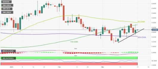 - NZD/USD는 2주 된 상승 지지선에서 반등한 후 소폭 상승했습니다.