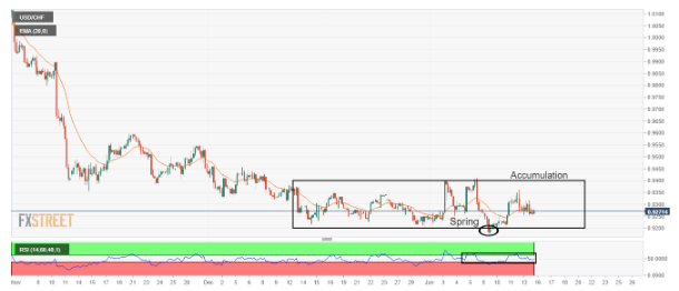 스프링의 형성으로 자산이 숲 속으로 밀려났습니다. 약세 편향 이후 확장된 통합은 강세 반전을 위한 재고 축적을 나타냅니다. 자산 가격과 겹치는 20-EMA는 통합을 앞두고 있음을 나타냅니다. USD/CHF 쌍은 자산의 상승이 약 0.9300으로 제한되고 하락이 0.9250으로 제한되기 때문에 초기 도쿄 세션에서 뒤죽박죽 움직임을 보이고 있습니다. 스위스 프랑 자산은 시장에서 위험 식욕 테마를 방어하면서 옆으로 돌아섰습니다. …