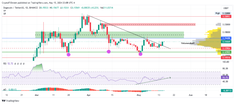 ✅ 비트코인 가격이 65,000달러 이상을 유지한다면 도지코인 가격은 15% 상승하여 0.18달러까지 상승할 수 있습니다.