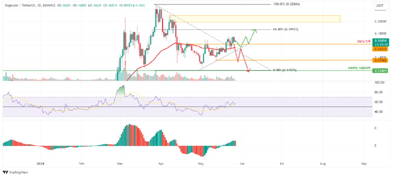 ✅ 도지코인 가격은 상승 모멘텀이 커지는 가운데 하강 추세선으로 인해 저항선을 넘어섰습니다.